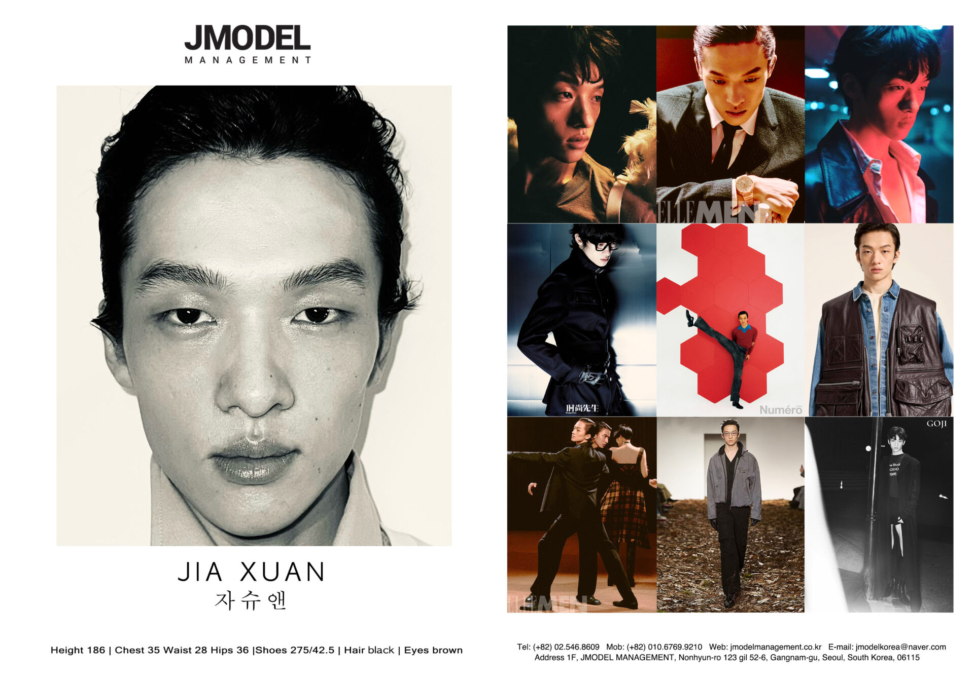 JIA XUAN Posted on by JIA XUAN height 186 chest 35 waist 28 hips 36 shoes 275/42.5 hair black eyes brown Compcard