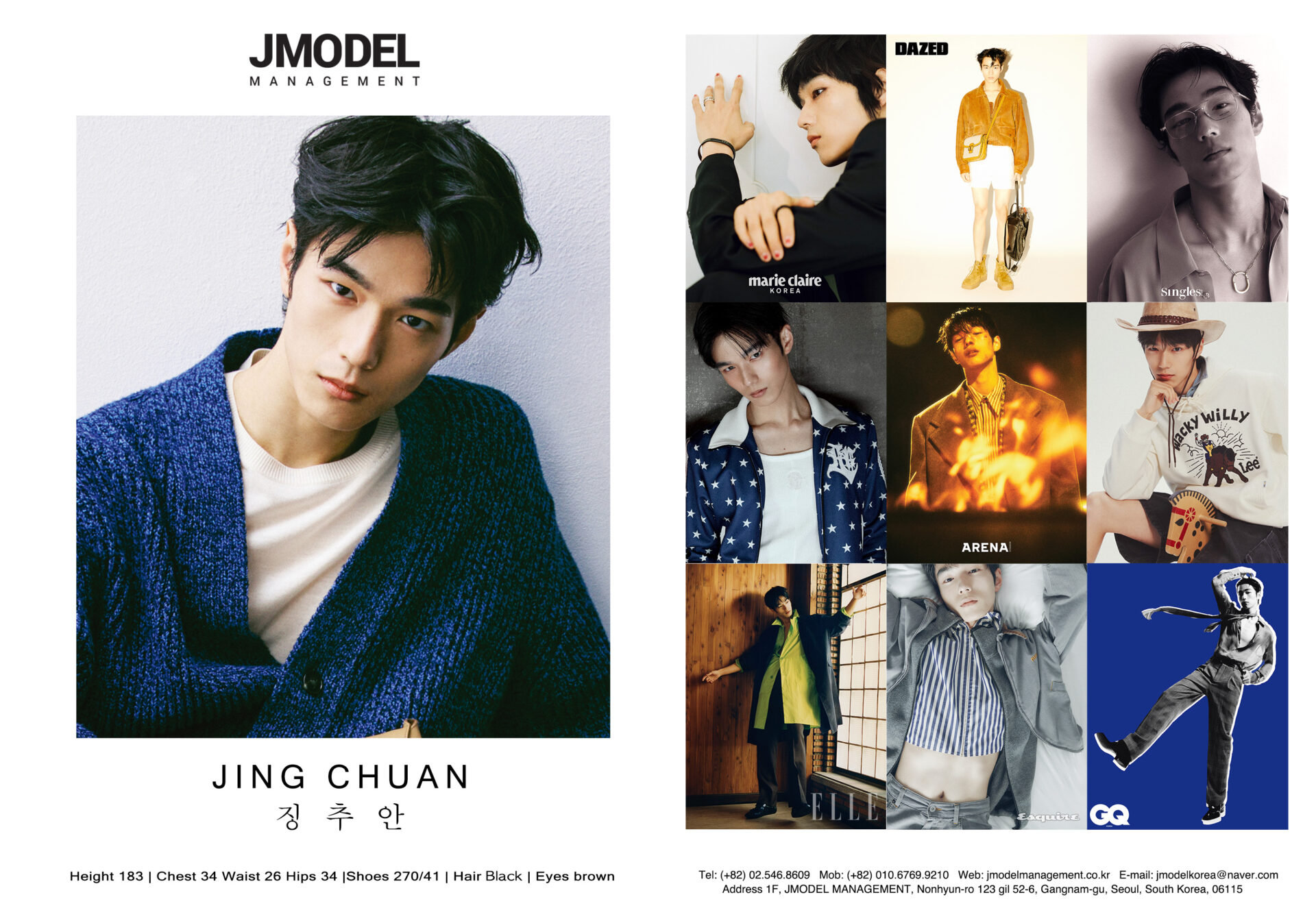 JING CHUAN Posted on by JING CHUAN height 183 chest 34 waist 26 hips 34 shoes 270/41 hair black eyes dark brown Compcard