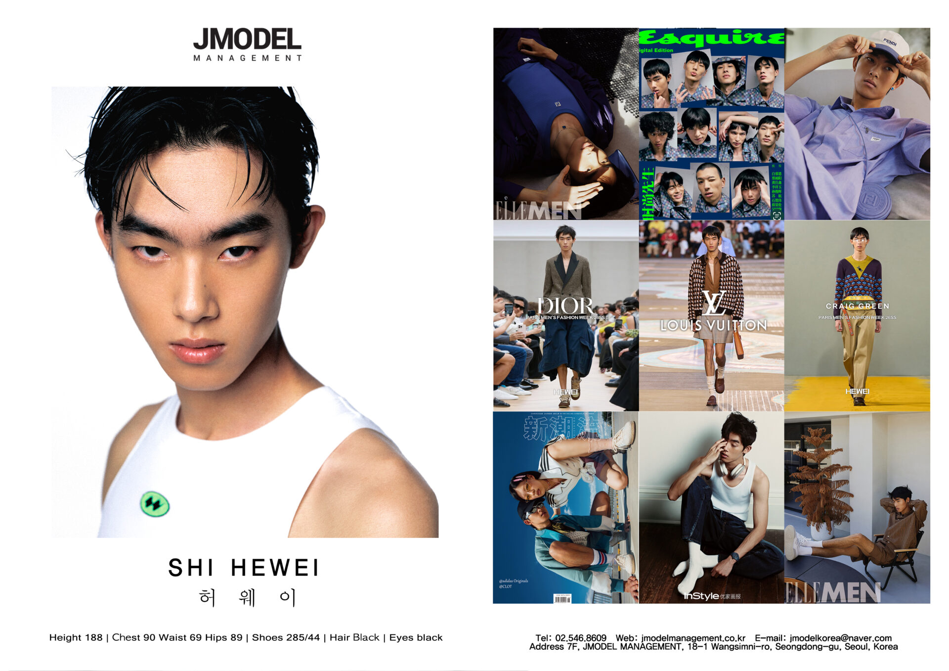 SHI HEWEI Posted on by SHI HEWEI height 188 chest 90 waist 69 hips 89 shoes 285/44 hair black eyes black Compcard Listed on Models.com