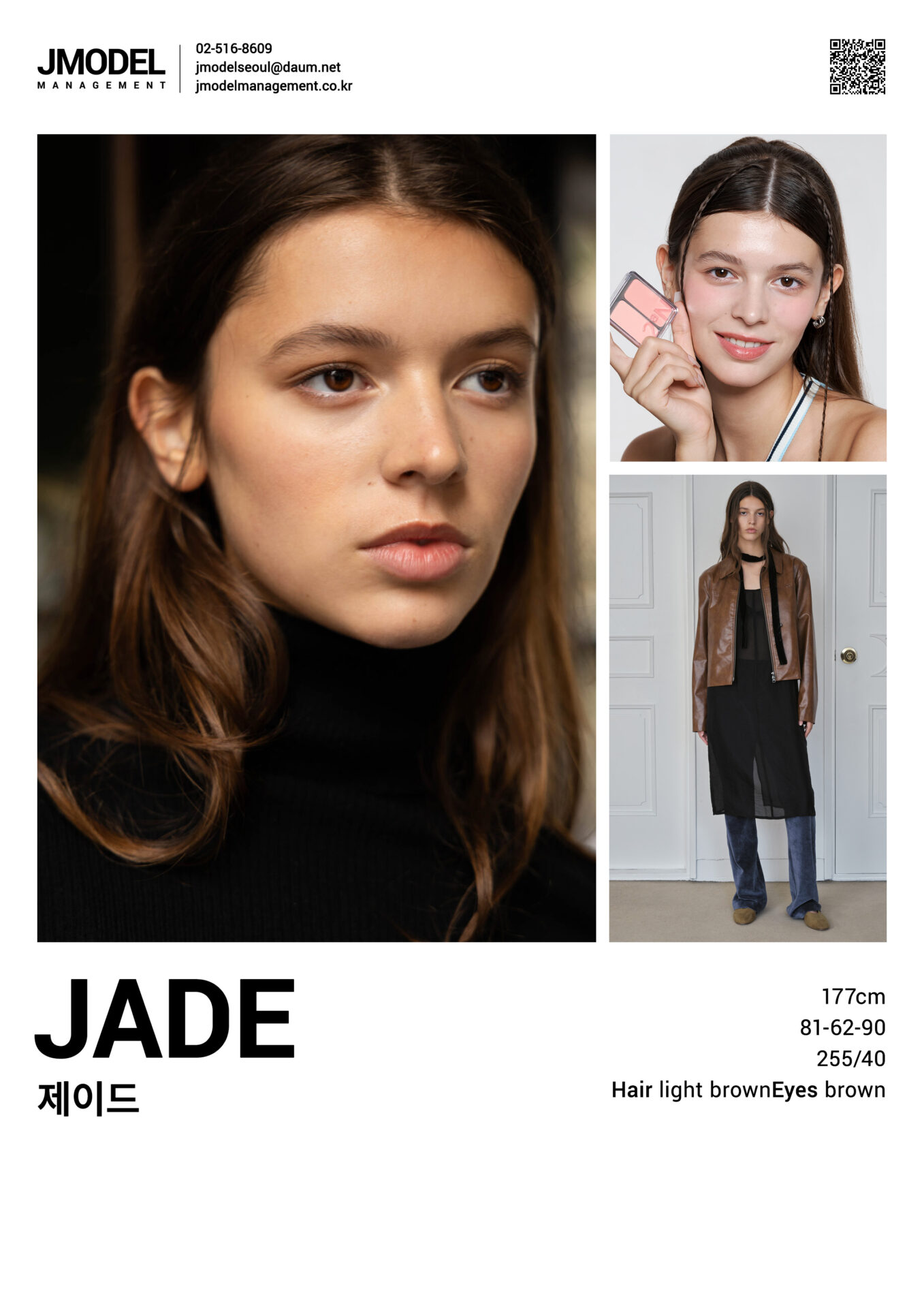 JADE Posted on by JADE height 177 bust 81 waist 62 hips 90 shoes 255/40 hair light brown eyes brown Compcard